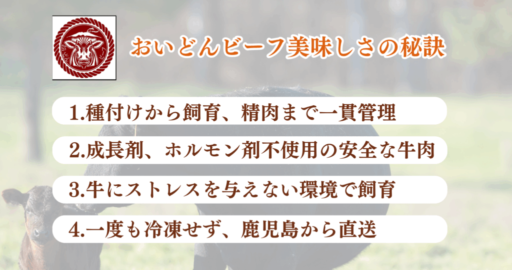 生産者の顔が見える安全、安心で美味しい鹿児島黒毛和牛を、牧場から直接食卓に直販することで実現できたお値打ち価格のおいどんビーフを、ぜひ、一度ご賞味いただければ幸いです。